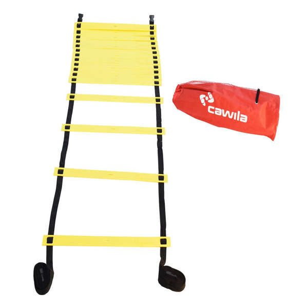 De Cawila Loopladder van 8 meter heeft verplaatsbare spalken, waardoor u zelf de afstand kan bepalen. De coördinatie ladder is vlak en gemaakt van slagvast en duurzaam PU materiaal en heeft een breedte van 50 cm. De spalken zijn zeer goed zichtbaar op het gras. Met de clip-lock systeem maakt het mogelijk meerdere spalken samen. Inbegrepen is een handige opbergtas. Het draagsysteem helpt u om ruimte te besparen en om de ladder makkelijk te transporteren. De Cawila Koordinationsleiter is een fundamenteel instrument voor een innovatieve coördinatie training en voor de moderne coach een populaire opleidingssteun.