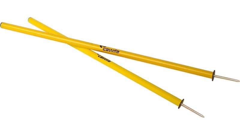 Slolomstokken met grondpin. De stokken zijn 1 meter 60 lang en hebben een doorsnede van 33 mm. Verkrijgbaar in de kleuren rood en geel.