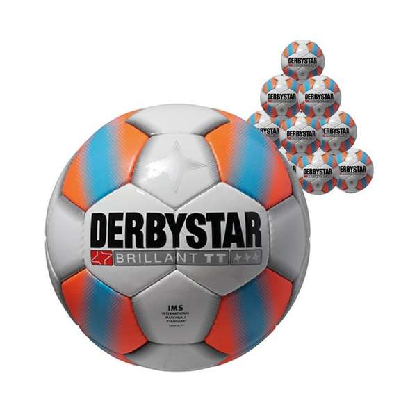 Derbystar Voetbal Brillant TT Wit oranje blauw 1238 10 stuks met gratis ballenzak en pomp € 219,95 incl. BTW incl. verzendkosten.